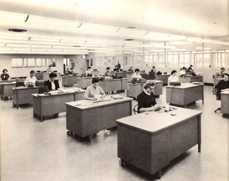 Eventually my dad moved up from the store level to the spacious and modern corporate offices, shown here when they opened in 1957.