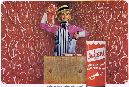 First up is the “wall of meat” ad for Accent, this one from 1965. That’s some wallpaper, but I don’t think it would last very long with my five dogs.