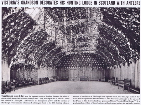 And speaking of walls of meat, how about a ceiling of deer heads? In this case, from 1937, there are over 3,000 heads with antlers “decorating” this hunting lodge owned by Queen Victoria’s grandson. And to imagine that someone had to dust them.