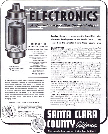 You may not think it that odd that the county of Santa Clara, home to Silicon Valley, would advertise itself as a center of the electronics industry. But this ad ran in 1945 when you were more likely to find plum trees there than computer circuits.