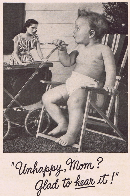 But they do get their revenge sometimes. For instance, babies, we discover in 1937, are not born with blackheads, and in 1948 the tables get turned and mom ends up in the baby stroller.