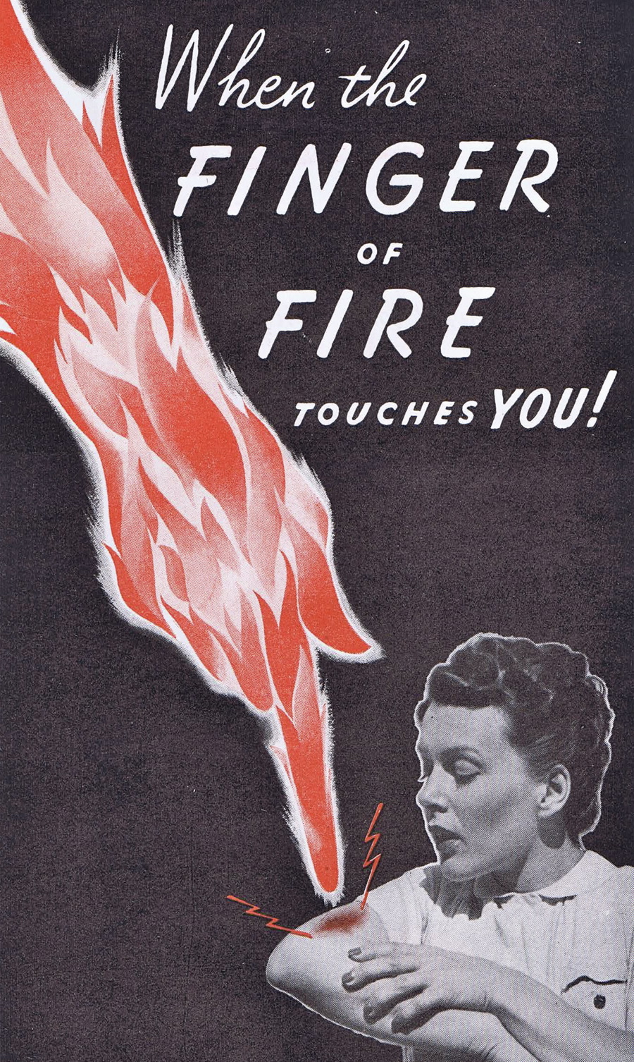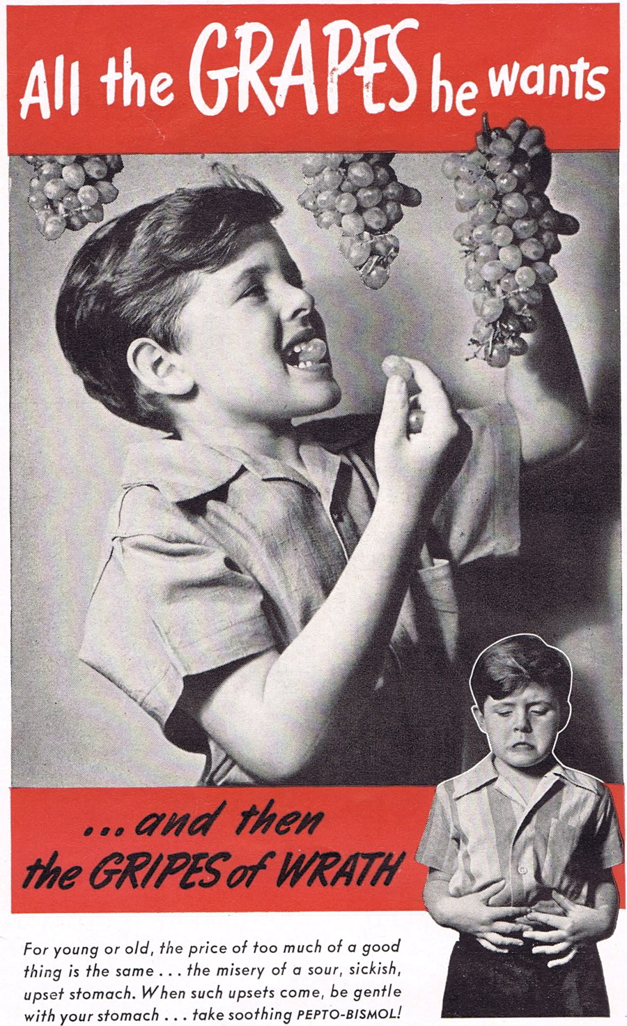 In 1942 when these two ads ran, you had to watch out for the long finger of fire, or be careful that your love of Steinbeck didn’t backfire, requiring a dose of Pepto Bismol.