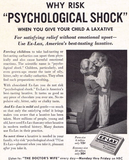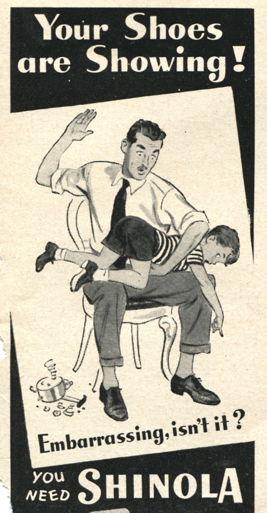 Poor kids. They are either getting spanked as in this ad from 1949 for Shinola shoe polish, or suffering the psychological shock of being given a laxative by mom (1952).
