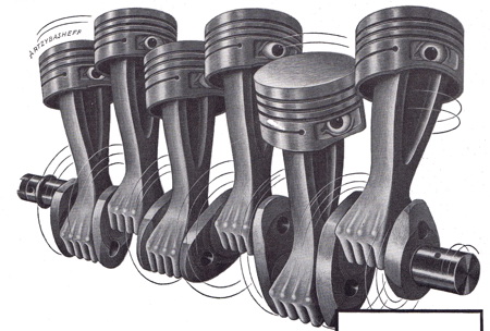 Dolls often give me the creeps, especially when they are big and dressed identically to the child, as in this case from 1954. And there is something very strange about pistons with eyes and hands.