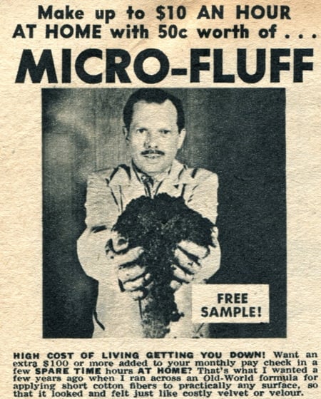 Lastly, even though I read the entire ad three times, I’m still not sure what 50 cents worth of “micro-fluff” is, and why it would bring you up to $10 per hour working in your spare time at home.