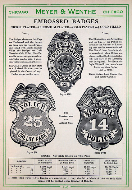 Figures 1 and 2. My experience with badges (above) would have been wider if I’d only lived a few decades earlier. My simple press-card from high school may have been a little more elaborate, as these four (below) press badges show. The simple Oakland Press Pass badge (upper left) cost $1.50 from the Ed Jones and Company in Oakland, but the more elaborate version given out by the Chief of Police (lower right) went up to $2.50. The other two badges are examples from the 1948 catalog of Meyer and Wenthe of Chicago, Illinois.