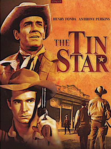 Figures 6 and 7. Star-shaped badges were the pioneer design of American badge history, and many sheriffs’ departments (above) adopted a six-point star badge. Even as departments moved to less pointed (and presumably less painful) badge designs, they often incorporated a star motif. A typical badge like these cost $3 to $5 in 1955, unless made of more precious metals. The movie the Tin Star (below) is a 1957 Anthony Mann western starring Henry Fonda and Anthony Perkins. Indeed, “tin stars” were badges often crafted by hand from the bottoms of old tin cans, which may have been the only available resource. As with all badges, it’s not the metal content but the symbol that counts.