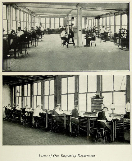 Figure 11. Badge production took place in many large cities, and was usually part of companies that manufactured other “marking” devices, such as metal traffic signs, rubber stamps, key fobs, dog tags, and other such things. Here, from a 1928 catalog, are two views of the engraving departments of the A.D. Joslin Manufacturing Company in Manistee, Michigan.