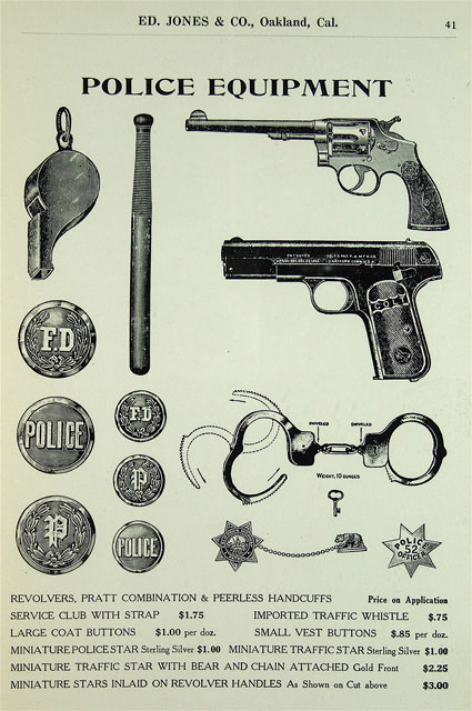 Figures 12 and 13. Badge producers, like the Ed Jones Company (still in business in Berkeley, California), often also sold police items, such as hand-cuffs, guns, whistles, and buttons (above). While some badge work was engraved by hand, machine engraving (below) was more common for the vast majority of badge designs.