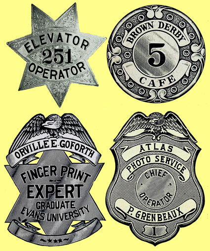 Figure 5. I would have never guessed that running a photo-processing lab merited a badge (bottom right) but there it was in the Meyer and Wenthe 1948 catalog (along with that of the finger-print expert). The elevator operator badge is from the Ed Jones Company in Oakland, and the Brown Derby Café waiter badge from the Mar-King Company of Los Angeles (who also made badges for the Los Angeles Police Department).