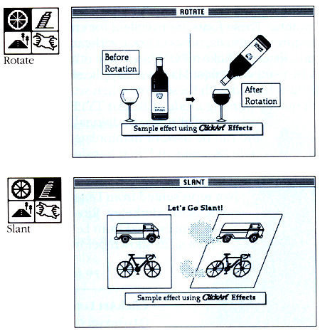 These scans are all from the actual material in the box, which was version 3 and released in 1987. PageMaker 1.0 was first released for the Macintosh in 1985. I believe version 3 was the first version for the then-new Windows. Below are two images from promotional material included in the box. The first is for bitmap clip-art, and the second is for a small software utility from T-Maker that allowed you to rotate a bitmap image and change it to a slant. That was hot stuff in 1987, sort of like The Bangles or the movie La Bamba.