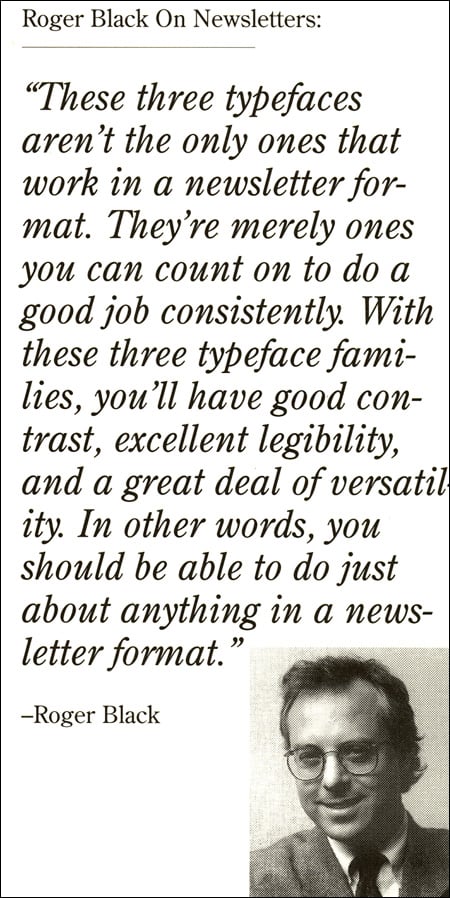 My favorite discovery in the PageMaker box, however, was an ad for one of Adobe’s very early type packages. It contained a “newsletter” font collection including Century OldStyle, Franklin Gothic, and ITC Galliard. Everything you might need to do a classic, well-designed newsletter. PageMaker may be dead and gone, but Roger Black lives on, only with considerably less hair.