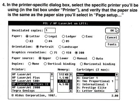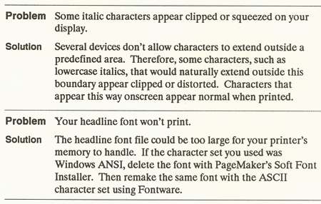 And God help you if you didn’t know how much memory was installed in your printer. As you can see below, the print dialog boxes in PageMaker were more demanding than many today. And below that, just a few Q&A items common to the day.