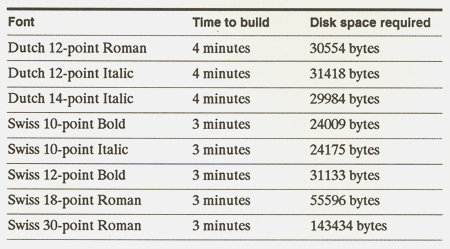 Here’s a chart estimating how many minutes it will take you to make a new display font for each size of each font you use in your document. That’s right, if you used a total of five sizes of Helvetica roman, and five sizes of Helvetica bold, there was 30 to 40 minutes of processing time before you could even start.