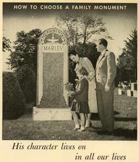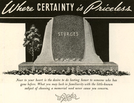 At the Catholic cemetery where my family members are buried, the gravestones are almost all flush with the ground, not of the “monument” variety pictured in these ads. I don’t know if that’s a Catholic thing or a reflection of the times — clearly the older cemeteries are more inclined toward true monuments instead of simple grave markers.