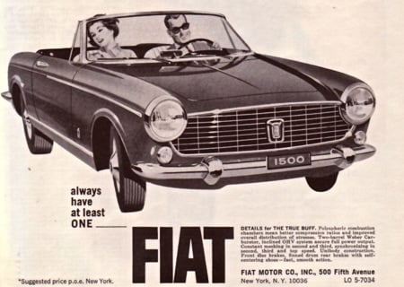 I’m old enough to remember when Fiats were a fairly common site on American roads — not as popular as Volkswagens, but surely more numerous than, say, Peugeots or maybe even Volvos. The sedans looked like good workhorses and the sports models were, well, shapely. One of my favorite college professors had a ’70s-era 1500 Spider convertible, and it was a joy to ride in.