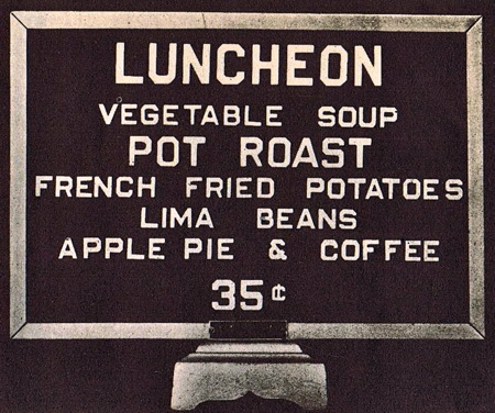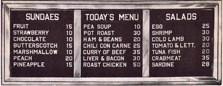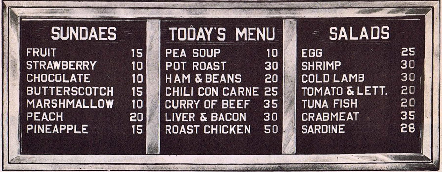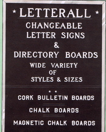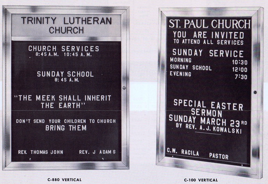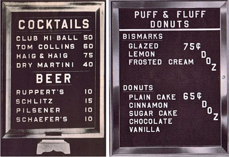 You could tell a lot about an establishment by the quality of its changeable-letter sign and the obvious care or disregard that went into laying it out. Could a dry cleaner with sloppy signage really do a good job cleaning your clothes? And could anyone who mixed fonts or sizes in the same word possibly provide decent service? These are from 1957 and 1950.