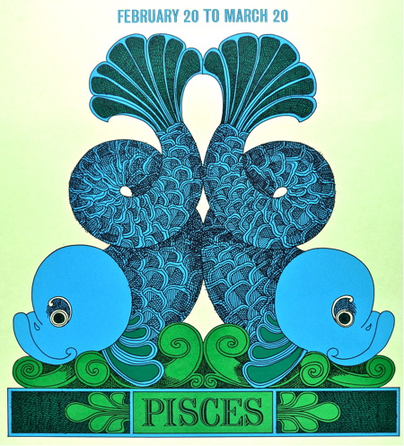 Pisces, the fish (February 20 to March 20) is ruled by Neptune and Pisceans tend to be dreamy, artistic, sensitive and compassionate. Those born under this sign are sometimes conflicted and can have difficulty making decisions.