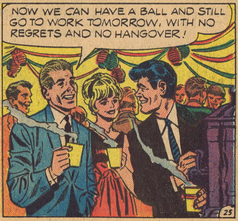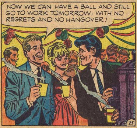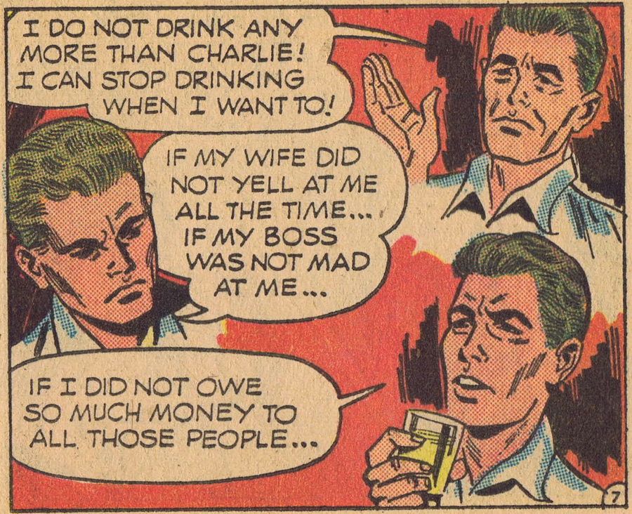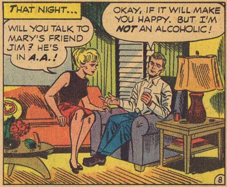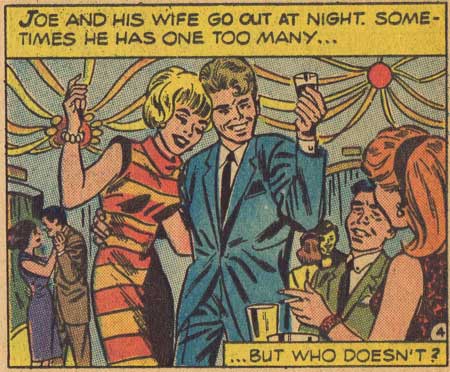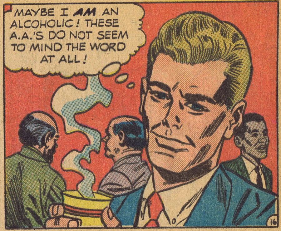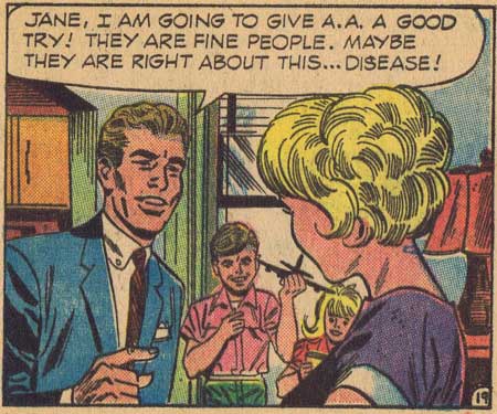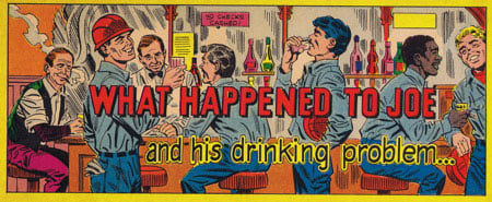 Today’s images are from a small booklet issued by AA in 1967 and again throughout the following years. In fact, you can find a modern-day version (complete with graphic-novel style drawings) at the AA website. The booklet traces the life of Joe, an alcoholic, through the phases of the disease and on to recovery. Click on any image for a larger version.