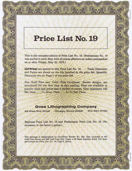 Goes began in 1879, several years before the invention of the film halftone-dot process of printing, so its methods began in the era of lithographic stones treated with grease, nitric acid, gum Arabic and water. This method made it possible to produce elaborate multi-colored editions of labels, stock certificates, and other highly decorative checks and office forms.