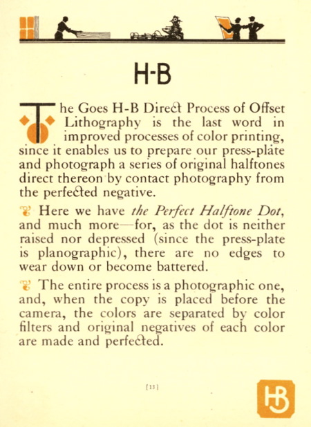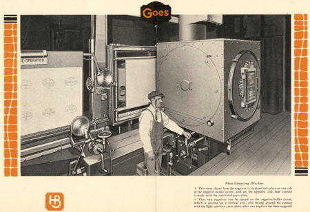 Thanks to the finer halftone dots of offset and the elaborate color-separation techniques pioneered by Goes, the company made a quick name for itself in producing fine-art posters for World Fairs, magician acts, pin-up calendars, and religious prints. Here, from a 1925 brochure about the company’s “HB process” of lithography, are several pictures showing the camera process used to make the film negatives used in the multi-color printing process.