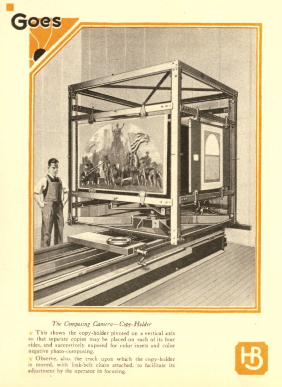 Thanks to the finer halftone dots of offset and the elaborate color-separation techniques pioneered by Goes, the company made a quick name for itself in producing fine-art posters for World Fairs, magician acts, pin-up calendars, and religious prints. Here, from a 1925 brochure about the company’s “HB process” of lithography, are several pictures showing the camera process used to make the film negatives used in the multi-color printing process.