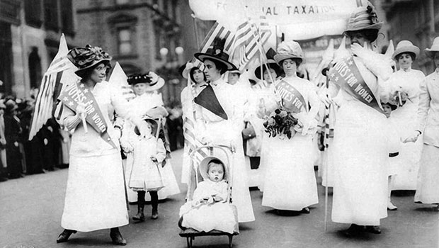 Despite a few rogue state laws that let women vote early on, by 1807 it was illegal for women to vote in all the states. And of course pretty much any man not of white European heritage was denied citizenship, and with it the right to vote. The first of those groups to gain voting rights (at least in the Constitution, if not in practice) were black men. In 1867 the Fourteenth Amendment extended citizenship (but not voting rights) to black Americans, and explicitly excluded women from full citizenship. In 1870, the Fifteenth Amendment extended voting rights to black citizens, but again, women were excluded.