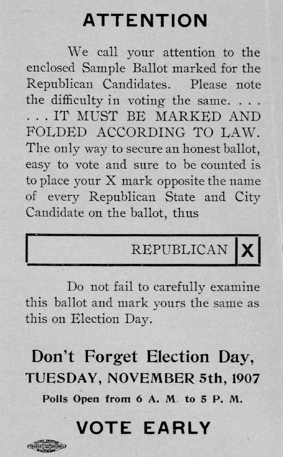 While hanging chads and electronic voting machines may seem like artifacts of the twenty-first century, there has always been concern about voter fraud and compromising the voting process. Here, from 1917, is a demonstration of a new electronic voting machine, followed by an 1876 illlustration from Ladies Home Journal showing witnesses watching a vote count, and two instructions to voters on how to properly cast their ballot.