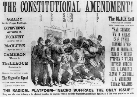 The usual fears surrounded the idea of giving black people the right to vote. Here’s a cartoon from 1877 suggesting that the Republican Party would be dead in the South if blacks voted, followed by a poster suggesting that it was radicals in Congress who voted for black suffrage.