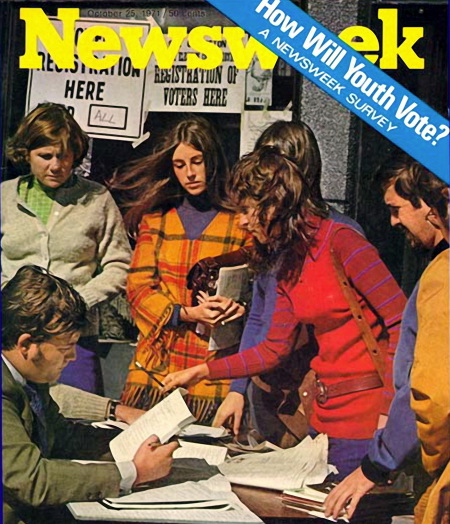 First up is a cover of Newsweek magazine from October 1971, posing the question “How Will Youth Vote?” Eighteen- to twenty-one-year-olds were the last large group of American citizens to receive voting rights. At the time this was controversial (as all expansions of voting rights are), but we were deep into the Vietnam War and it was hard not to agree that if you were old enough to die for your country, you ought to be old enough to vote for your leaders.