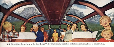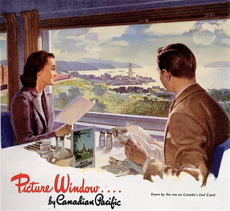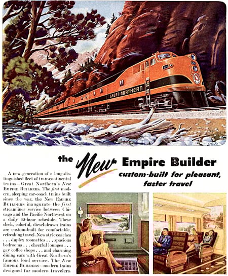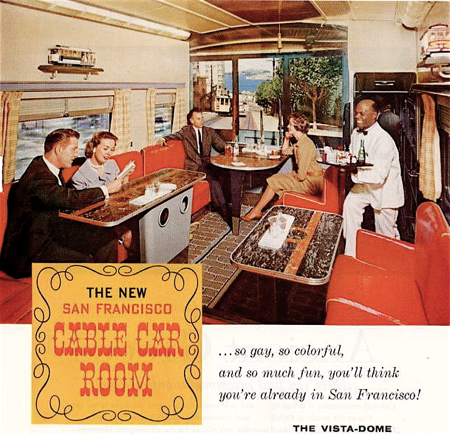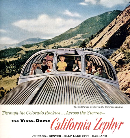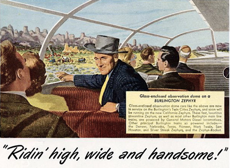 Accordingly, the other big emphasis in vintage train advertising is the views, and how the various railroads made it easier to see them. And while I can appreciate a breathtaking sunset as much as the next person, I do have to say I’d probably spend more time in the observation car when going through urban areas than rural ones. I think cluttered backyards and laundry hanging on the line is the more interesting picture of America.