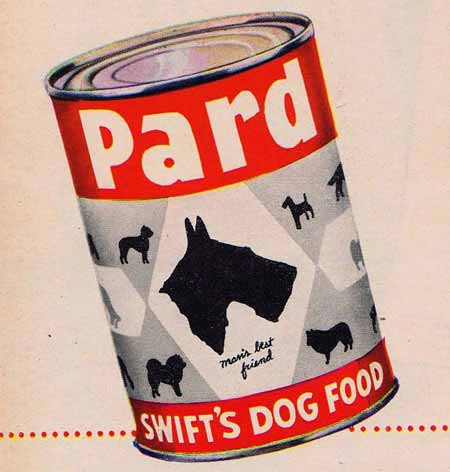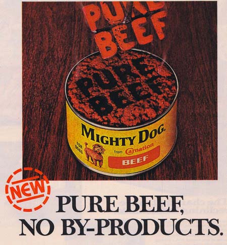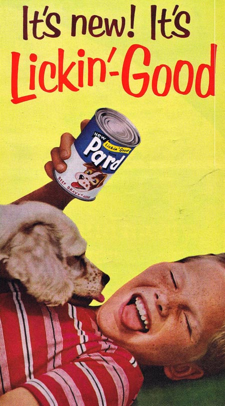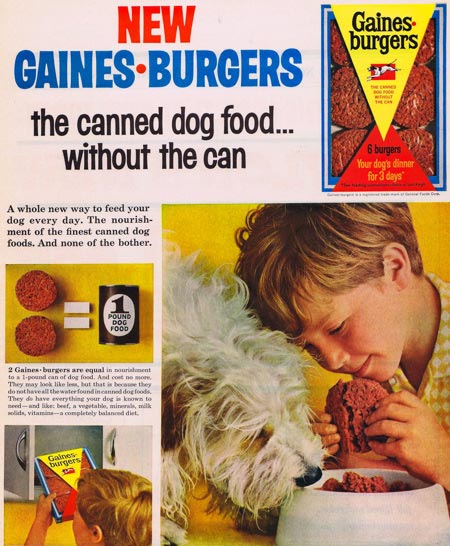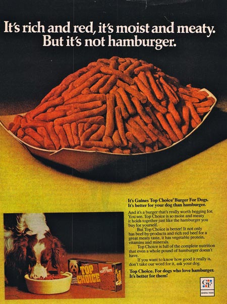I always liked the “fake hamburger” phase of dog food, which took place in the 1960s and early ’70s. Here are ads from 1964, 1967, and 1973. If it looks good to us, it must look good to the dogs, right?