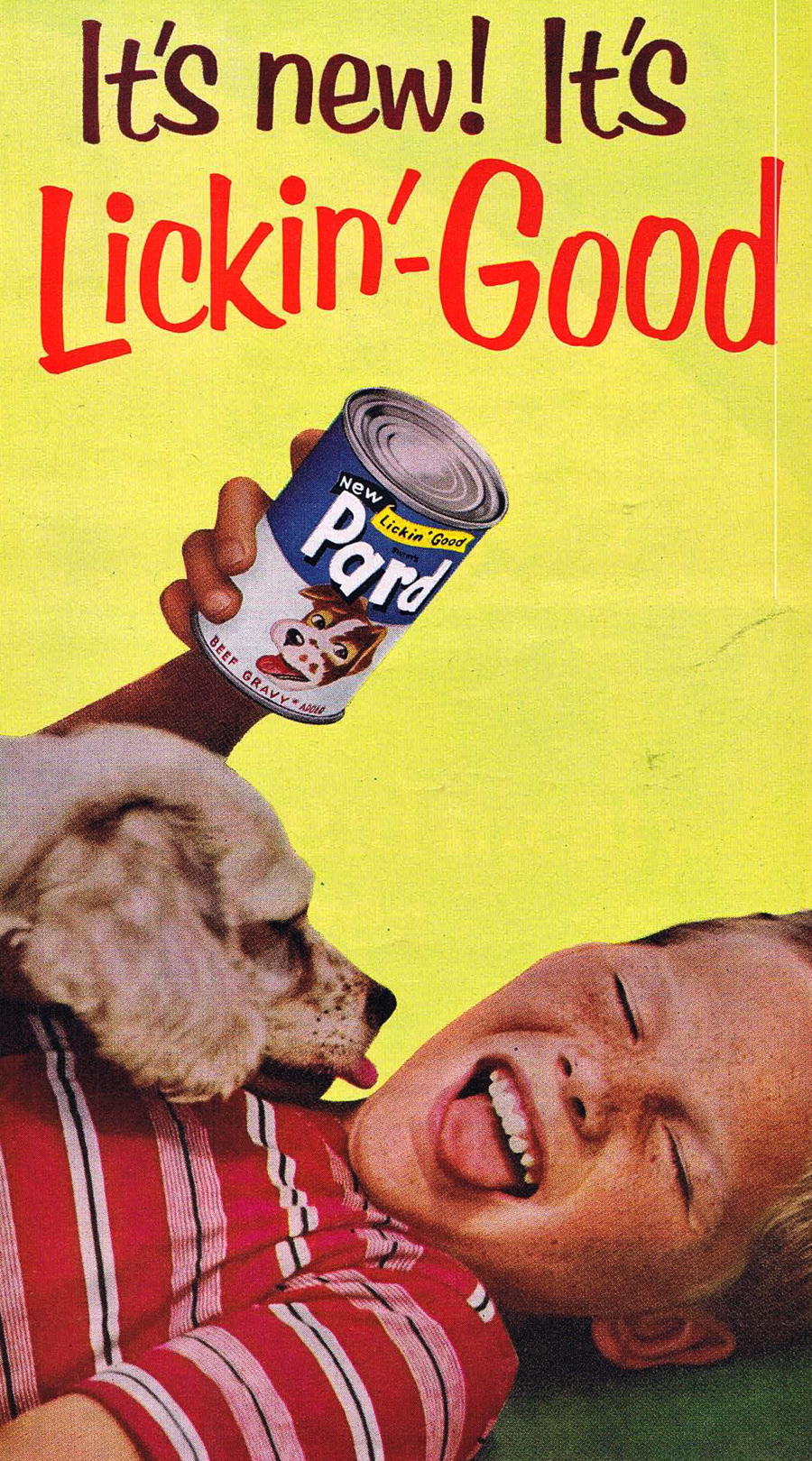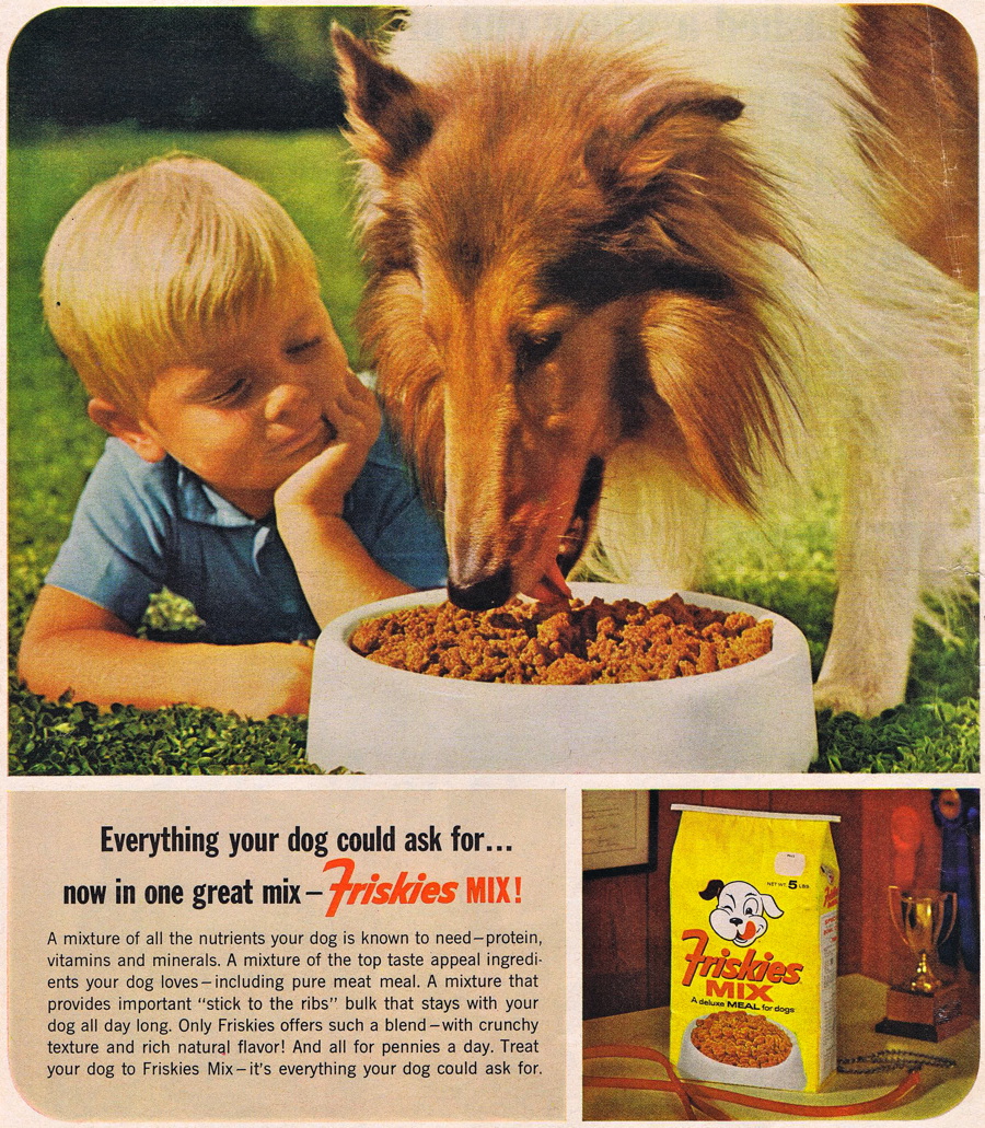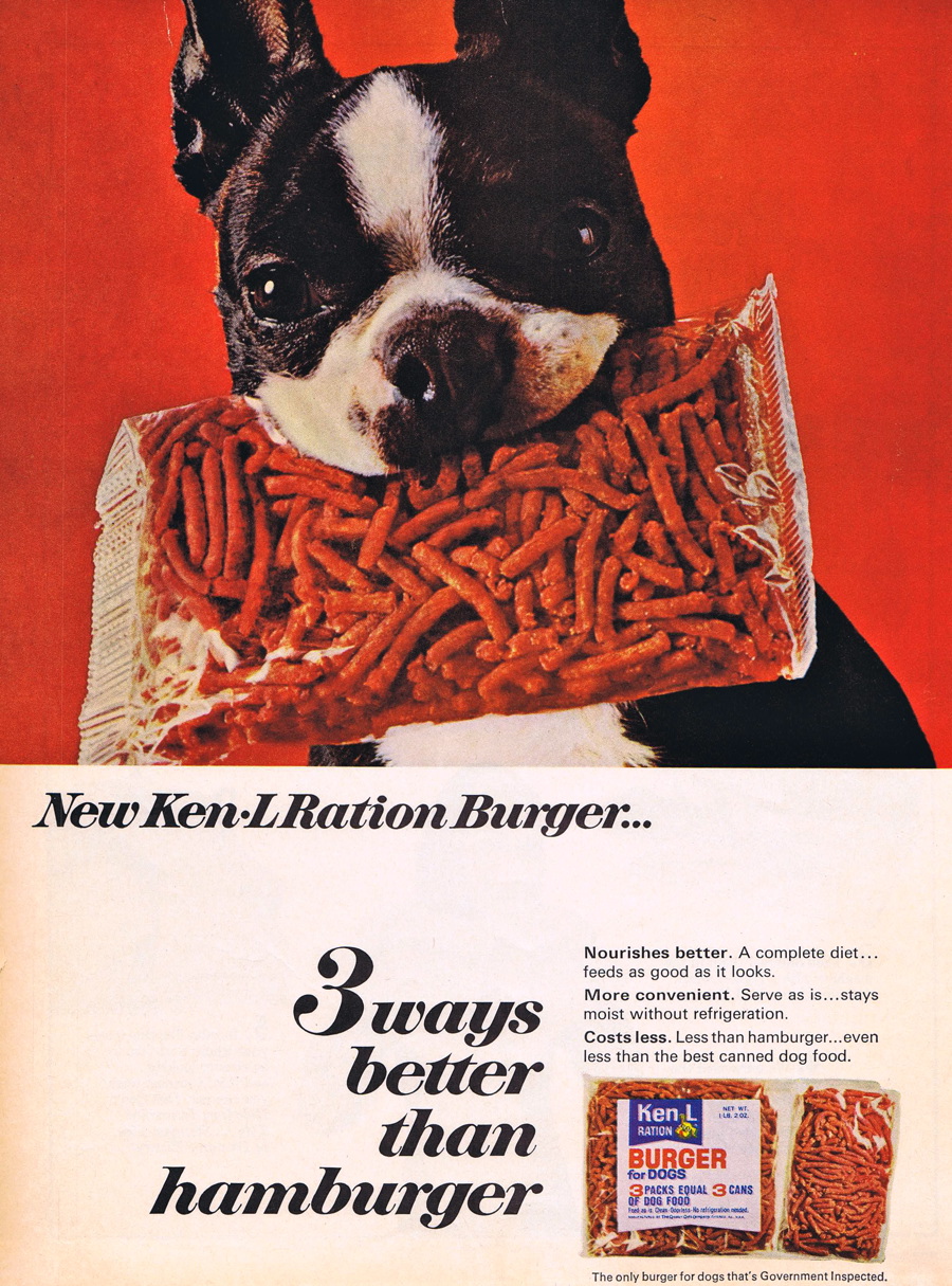 I always liked the “fake hamburger” phase of dog food, which took place in the 1960s and early ’70s. Here are ads from 1964, 1967, and 1973. If it looks good to us, it must look good to the dogs, right?