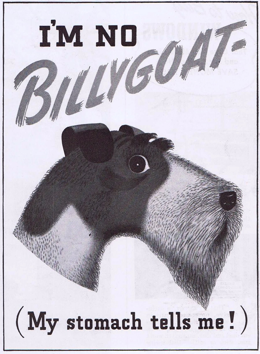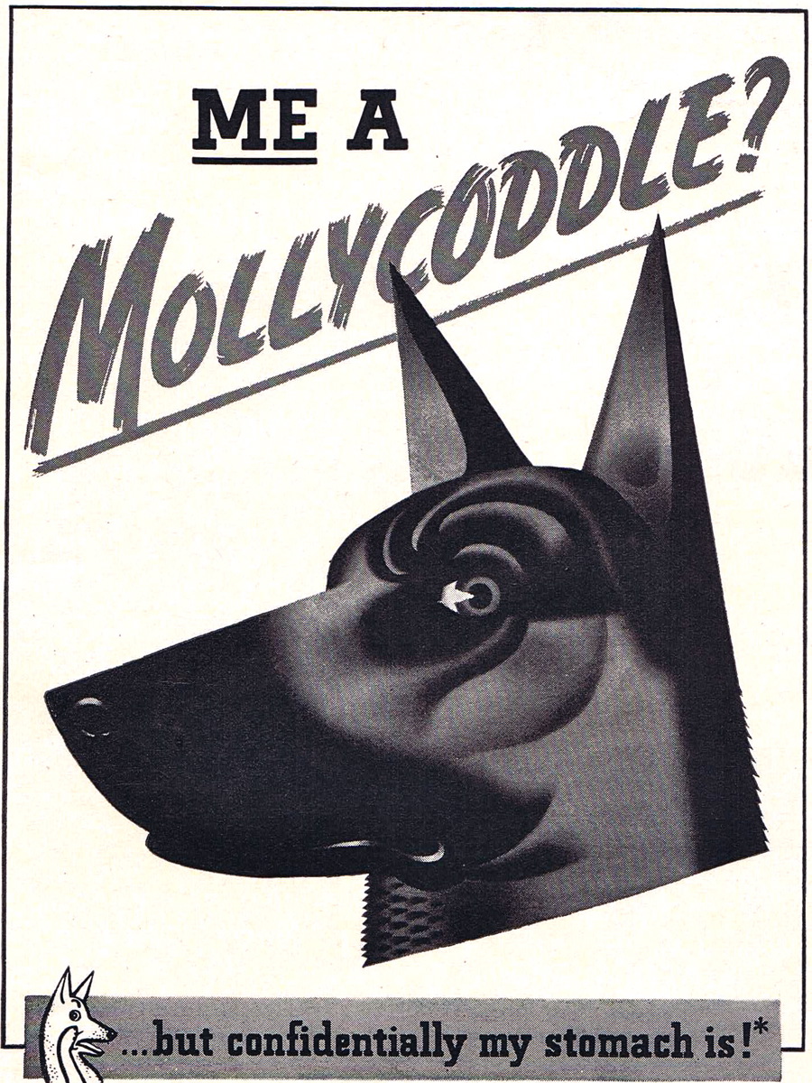 The selling of dog food seems to cycle through one of several themes. It’s either better for the health of your dog, easier for you, or tastier to your dog. Hopefully, it’s all three. These two drawings are from 1941.
