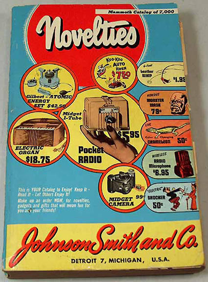 It’s interesting to compare the current Johnson Smith & Co. Web catalogs with those of the past. Quite a few items from my 1940 version have changed very little, still causing red faces and peals of laughter more than 60 years later. Of course as expected, something that once cost 12 cents is now 12 dollars. And even though it still seems to be a very friendly company, you won’t find this kind of copy in a current catalog: “Remittance may be sent in any form most convenient to yourself. Just please yourself. It is immaterial to us how you send your money as long as it is in some cashable form. You can remit by money order, bank draft, currency, coin or postage stamps.”