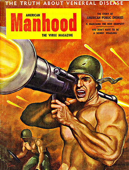 Figure 2: In some cultures manhood begins when a young man first has to fight for his honor or survival. This cover from Manhood magazine is typical of the 1940s image of real men.