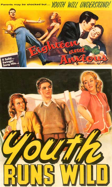 Figure 3: Teens out of control was, and still is, a popular movie theme. Here, two films warn of the gap between teen enthusiasm and adult responsibility. Above, from Republic in 1957 is “Eighteen and Anxious.” Bottom is the 1944 RKO picture “Youth Runs Wild.”