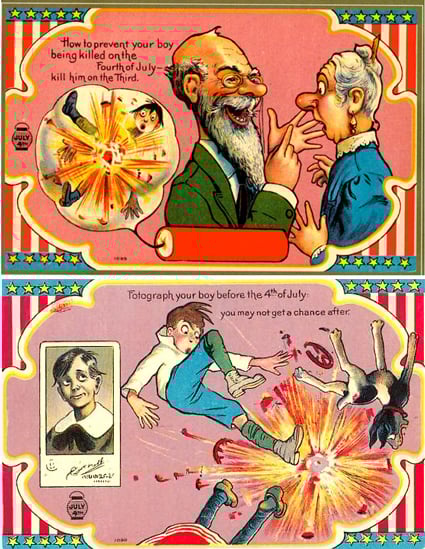 Figure 5: Firecracker safety was taken pretty lightly in the time of these images from turn-of-the-20th-century postcards, exact dates unknown. Boys will be boys, and sometimes the best way to save them is to kill them!