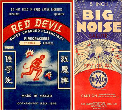 Figure 7: Red Devil firecracker package from 1948 (made in Macau, China), and Big Noise firecrackers (made in New York). Both images are from the terrific web site www.crackerpacks.com, which has a huge collection of vintage firecracker labels.