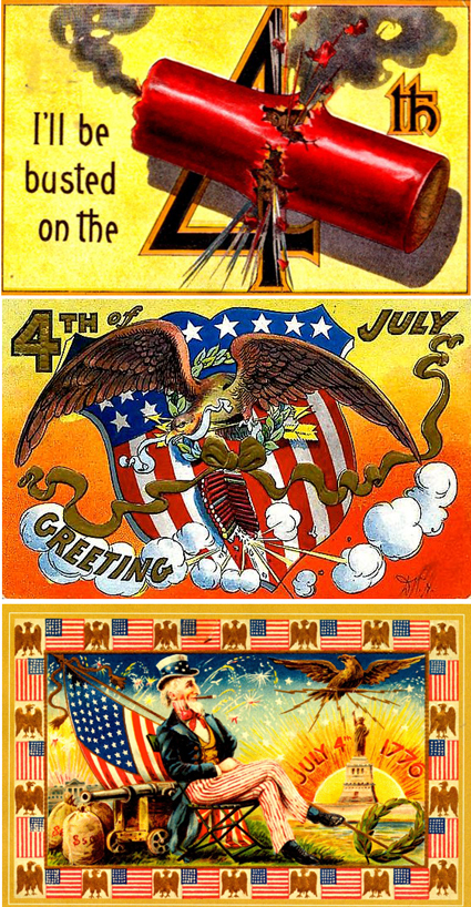 Figure 9: More postcard images showing America’s fascination with fireworks and the close association with the Fourth of July. The bottom card is from printers Gottschaulk and Dreyfuss, which, ironically, was printed in Germany.