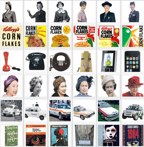 See the changes in British Airways flight attendants, Corn Flake packets, telephones, the Queen’s hats, police cars, and book covers of George Orwell’s Nineteen Eighty-Four.