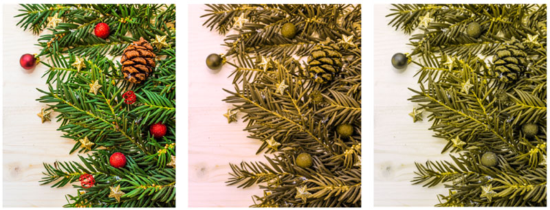 Figure 1. Christmas decorations as someone without color blindness would see them versus how someone with a form of red-green color blindness might see them