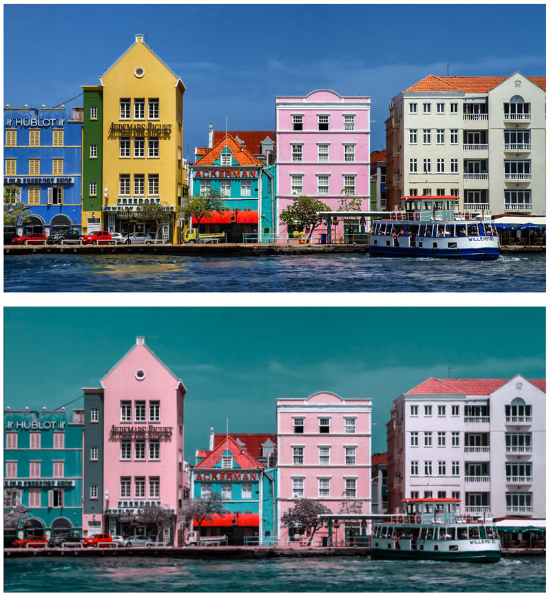Figure 2. The top photo shows how someone without color blindness would see these buildings, and the bottom one shows how someone with a type of blue-yellow color blindness might see them.