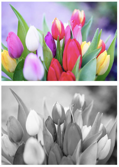 Figure 3. A bouquet of tulips as someone without color blindness would see it and how someone with complete color blindness would see it
