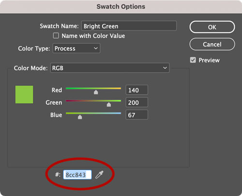 Figure 5. Color swatches in RGB and HSB mode display their equivalent hexidecimal values in the Swatch Options dialog box.