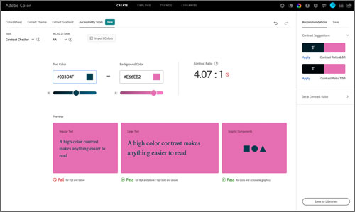 Adobe added a similar color contrast analyzer to the Adobe Color website. You can enter hex values or upload an image and sample colors from it to see if they meet the WCAG AA and AAA standards. Sliders underneath the input boxes allow you to adjust the colors until you achieve the desired ratio. Alternatively, you can quickly apply suggested color combinations or enter a desired ratio and have the tool adjust the colors to meet that standard (Figure 7). You can then save the color combination in a Creative Cloud Library where it will be labeled with the WCAG standard it meets.