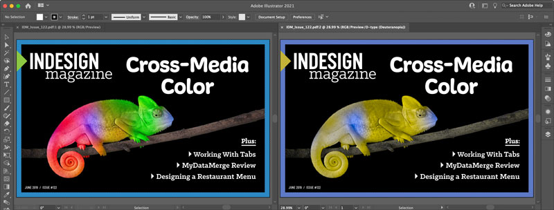 Note that to get the most accurate color-blind proof colors your documents need to be in RGB mode.