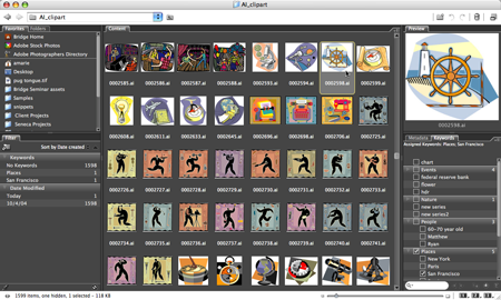 Figure 2. Unlike its templates and libraries, the clip art that comes with Illustrator CS (any version) doesn’t get installed by default. You have to manually copy the folder that contains them from the installation discs. For details, see an article I wrote a couple years ago. Once the assets are on your hard drive, add their folder to Adobe Bridge’s Favorites panel for a handy place to browse through them. Click on the image below to see a larger version.