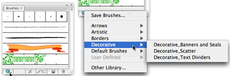 Figure 3. In Illustrator CS3, any panel that has additional libraries (swatches, symbols, etc.) has a convenient Libraries button in its lower-left corner (left). Click it to reveal the list of libraries (right) and select the one you want to open.