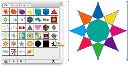 Figure 4. Lots of fun artwork here, but the star shape (left) by my cursor in the Decorative Scatter brushes library looks vaguely daisy-like, so I dragged it out of the library onto the artboard and then scaled it up (right) to get a better look. Hmm.. maybe.